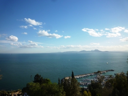 perché sur une falaise surplombant la baie de Tunis, à l’ombre vénérable de la mythique Carthage. Lieu de villégiature prisé depuis longtemps des fortunes locales ou plus lointaines, Sidi Bou Saïd incarne une certaine douceur de vivre à la Tunisienne et arbore ses belles demeures d’architecture arabe ou andalouse avec la Méditerranée en toile de fond. Paysage de carte postale. Ruelles escarpées et terrasses langoureuses. Façades blanches et portes bleues. Douceur du climat alors qu’il fait froid ailleurs. Envie de flâner, de s’attarder, de rester… au moins quelques jours.