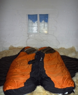 alors temps de se glisser dans son sac de couchage spécial Arctique (simple ou double…) sur son lit de glace et de savourer le silence envoûtant de cette nuit glacée au milieu des montagnes. Etonnamment, on n’a pas froid et il est même très agréable d’humer cet air pur et frais (0°C ni plus ni moins…) sur le bout de son nez, le corps bien au chaud et bien emmitouflé dans son duvet moelleux.