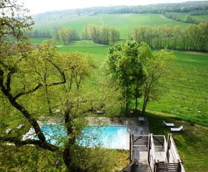Le jardin… Esprit anglais et campagnard, pelouse et pâquerettes, quelques tables pour s’attarder au soleil ou prendre l’apéritif le soir. Au fond, à l’aplomb de la colline sur laquelle est juché le château, un sentier se dessine puis se mue en escalier de bois qui plonge vers la piscine. A l’abri des regards, un immense couloir de nage, une terrasse de teck et des transats dépareillés attendent le nageur souhaitant brasser et bronzer le regard perdu sur les vignes et les collines. Décor de bois et de pierre mêlé au vert de la vigne à deux pas en contrebas, une ambiance zen qui s’offre à la nature et aux rayons du soleil, dès le matin et jusqu’en fin de journée. Est, ouest, eau, terre, pierre… Zénitude…