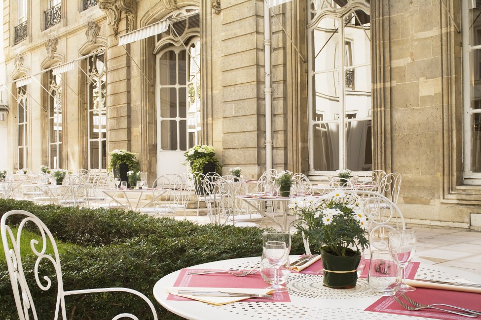 murs de pierre et piscine intérieure. Mais cet hôtel au luxe discret cache aussi en son sein une cour intérieure avec ses buis sagement taillés, sa fontaine romantique couverte de lierre et son gravier qui crisse sous les pas. Parsemant le cheminement à l’ombre des murs de pierre de cet hôtel particulier d’un autre siècle, quelques tables de fer forgé ou de teck patiné et leurs parasols invitent à prendre l’air ou le soleil à l’heure du petit-déjeuner, du thé, de l’apéritif ou mieux encore à l’occasion d’un brunch du week-end.