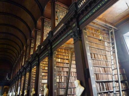 Pénétrons tout d’abord dans le cercle du savoir, Trinity College, pour une pause culturelle (et rajeunissante…) dans la quiétude de l’enceinte de la plus ancienne université irlandaise fondée en 1592. L’ambiance y est étudiante, sérieuse et déconctractée, jeunes gens en bermudas ou doudounes selon la saison qui déambulent, courent de cours en cour, papotent et se reposent. Mais Trinity College recèle aussi un trésor et un lieu magique. C’est en effet ici que s’admire un des plus beaux manuscrits enluminés datant de l’an 800, le Livre de Kells, conservé dans la Old Library. Construite entre 1712 et 1732, elle jouit aussi depuis 1801 du privilège du dépôt légal des ouvrages publiés en Grande Bretagne et Irlande. Quelques trois millions de volumes sont conservés ici, dans huit bâtiments… Mais le lieu le plus magique, pour qui aime les livres, est sans doute la « Long Room » ou Galerie, longue de 65 mètres et qui arbore sur ses murs quelques 200000 œuvres parmi les plus anciennes. Une voûte en berceau, des bustes en marbre de grands auteurs, ces livres anciens chargés d’histoires et d’Histoire : la magie est là et on pourrait y rester des heures.