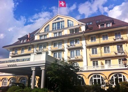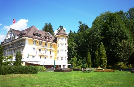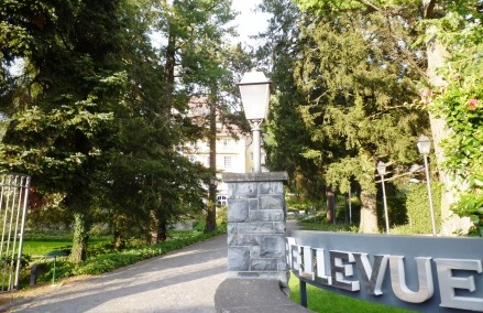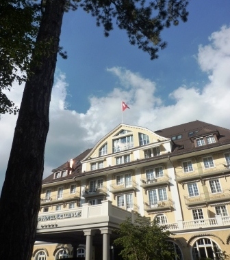 sur le chemin. Aperçue depuis la Hauptstrasse (la Grande Rue) de Gstaad, la bâtisse classique et élégante, aux larges façades jaunes et à la tour imposante sur laquelle flotte le drapeau suisse, apparait au cœur d’un parc arboré. Un charme désuet se dégage déjà des lieux, et l’ambiance oscille entre conte de fée et luxe discret avec ce petit soupçon de romantisme qui émeut les cœurs. Il faut dire que le vénérable hôtel a fêté ses 100 ans en 2012 et affiche une longue histoire. Le Grand Bellevue est depuis longtemps déjà une des adresses les plus prestigieuses de la très chic Gstaad et compte bien poursuivre la tradition de l’hospitalité de luxe et de raffinement.