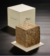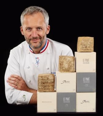 Fabriqué dans l’Aveyron par Alain Mazars et ses 20 vaches, c’est un fermier pur souche, au lait cru, qui pèse entre 600 et 800 grammes selon son âge, mesure 12 centimètres de côté, et se présente dans une jolie boite de bois qui sert à la fois d’emballage et de cave de conservation. Sa croûte rappelle la pierre (ou les plateaux sauvages du Ségala autour de Baraqueville où paissent les 20 vaches d’Alain ?) et sa pâte évoque à la fois un Cantal ou un Bethmale. Mais en fait, il ne ressemble à aucun autre : François Bourgon, MOF depuis 2011 et jamais à court d’idées, est en train d’imaginer un outil qui ne soit pas tout à fait un couteau pour couper le fameux cube (comment couper un fromage en cube ?) qui se prête, un peu comme un Parmesan, au grignotage sous forme de copeaux. Variante : le couper en cube présentés dans le cube. Casse-tête ? A la dégustation, le Pavé est facile à vivre pourtant, avec, par exemple, un vin rouge peu tannique.