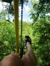 Mon expérience dans les grands arbres: Un drôle d’engin suspendu sur un câble qui court au milieu des arbres: l’ensemble a des airs entre le pédalo de notre enfance et le télésiège de l’hiver au ski, on y est assis mi-allongé et