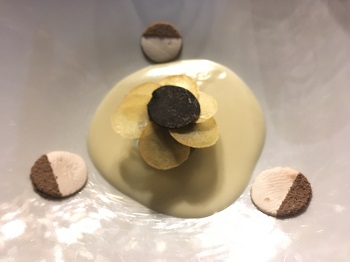 Autre temps fort d’un repas à l’Ursus: le chariot de fromages avec son assortiment de Beaufort, Tomme des Bauges et autres persillés et chèvres d’ici et d’ailleurs. Vient ensuite le moment du sucré avec des desserts très travailles mais très gourmands comme cette variation chocolatée dans son oeuf de céramique. Mais le repas ne s’achève vraiment qu’avec les mignardises, chocolatées aussi, présentées sur leur parterre de mousse verte. Cette balade en forêt s’agrémente bien sûr d’accords mets et vins classiques mais bien choisis. Une jolie balade qui reçoit à juste titre la reconnaissance d’une première étoile.