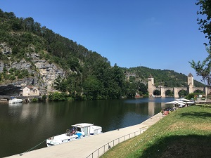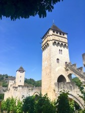 Le lendemain sur le coup des midis, sous le pont Valentré, on y mange, on y mange : si possible chapeautés contre le soleil et avec la nappe à