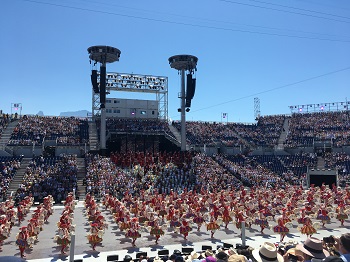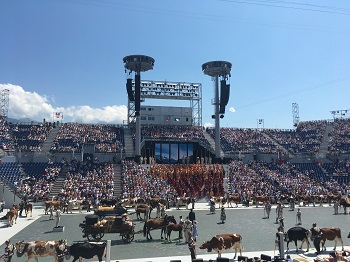 Le spectacle rend ensuite hommage aux « Trois soleils » (l’astre lui-même, le lac qui réverbère la lumière et les pierres des murets qui emmagasinent la chaleur et la restituent à la vigne) et la parade célèbre les vignerons honorés. Mais parce que la Suisse est bien autre chose que la vigne, les traditions alpestres s’invitent dans la fête, vaches décorées comme pour la désalpe et cor des Alpes évidemment. L’émotion est palpable dans l’arène, la Suisse et les Suisses vibrent à l’unisson de leurs vignerons et de leurs troupeaux. Symbolique de l’engagement des jeunes générations, « Protection de la Vigne » invite les chœurs d’enfants pour un « Hymne à la Terre » et un « Epilogue » qui signe la fin de ce spectacle foisonnant.